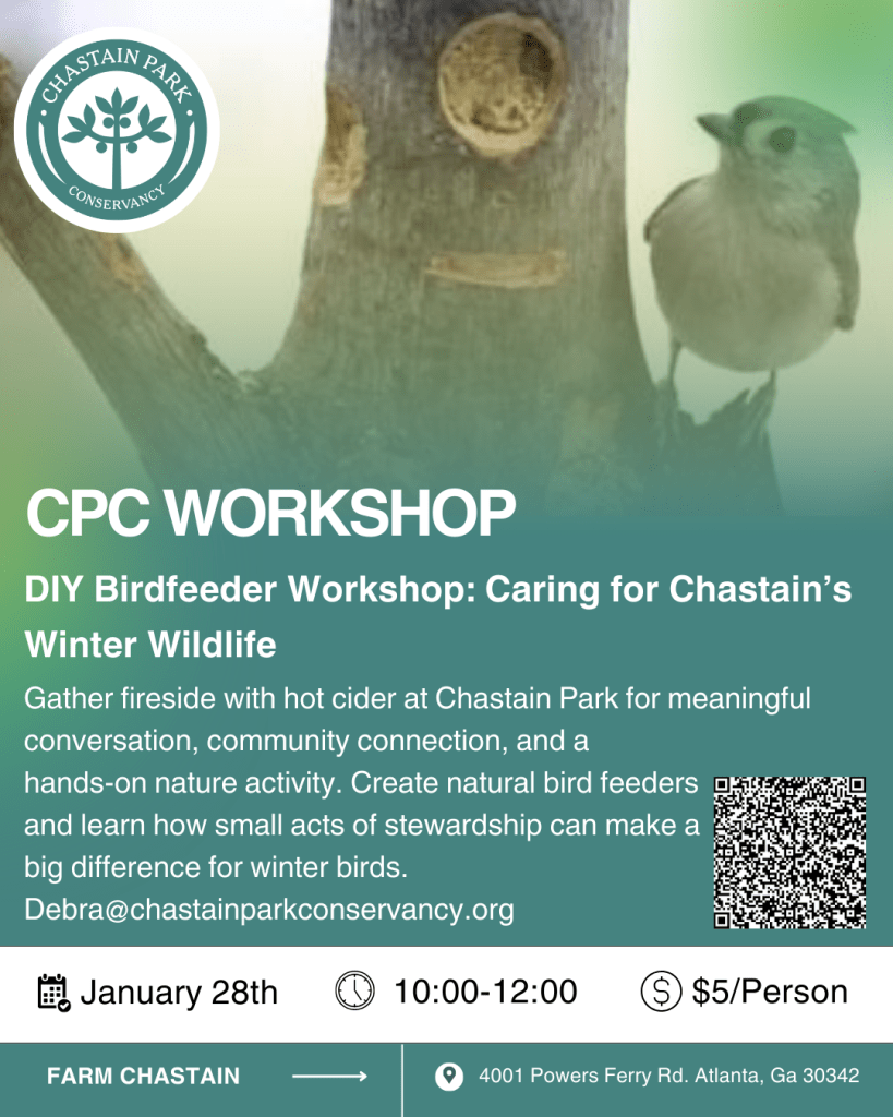 During this hands-on workshop, participants will create their own DIY birdfeeder using simple materials, guided by our team. You’ll also learn about the birds that call Chastain Park home, what they need to thrive in winter, and small steps you can take in your own backyard to make a difference.